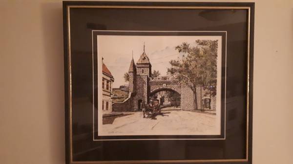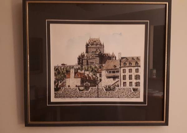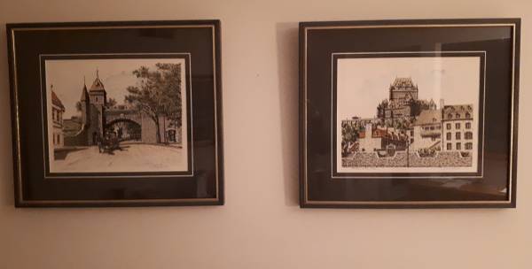 Framed art print drawings of Porte St. Louis, Quebec, and Chateau Frontenac, Quebec. Prints are in excellent condition and preserved under glass. Frame measures approximately 19 inches by 22 1/2 inches by 1 1/4 inches. Smoke free environment. Please review photos for details. (photo 7 is painter's signature) Price $400.